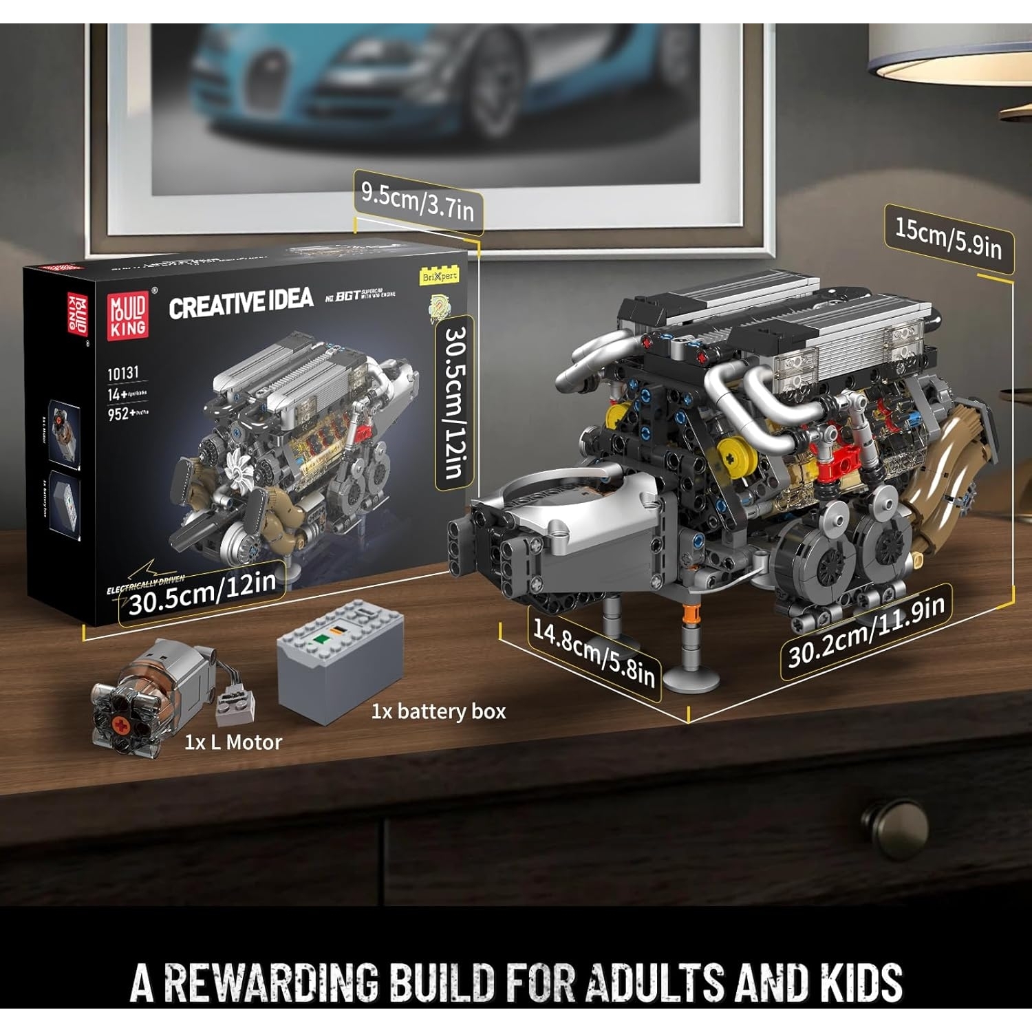 Aus 952 Teilen entsteht ein detailliertes Modell mit rotierenden Kolben, transparentem Zylinderkopf, Twin-Turbo-System und realistischem Abgaskrümmer – inspiriert vom Antrieb moderner Supersportwagen. Ein leistungsstarker Elektromotor und ein wiederaufladbarer Akku bringen das Modell zum Leben und zeigen die Funktionsweise des Ventiltriebs und der Kurbelwelle in Bewegung. Ein spannendes Technikprojekt für alle ab 14 Jahren, das Verständnis und Begeisterung für echte Motorleistung weckt.