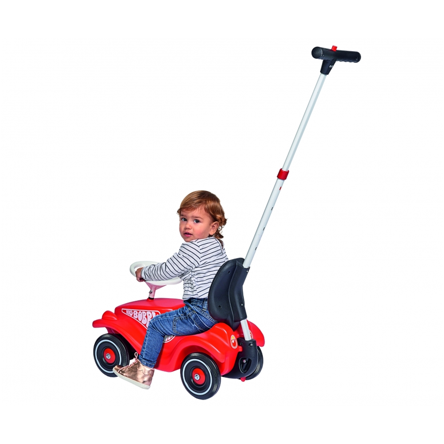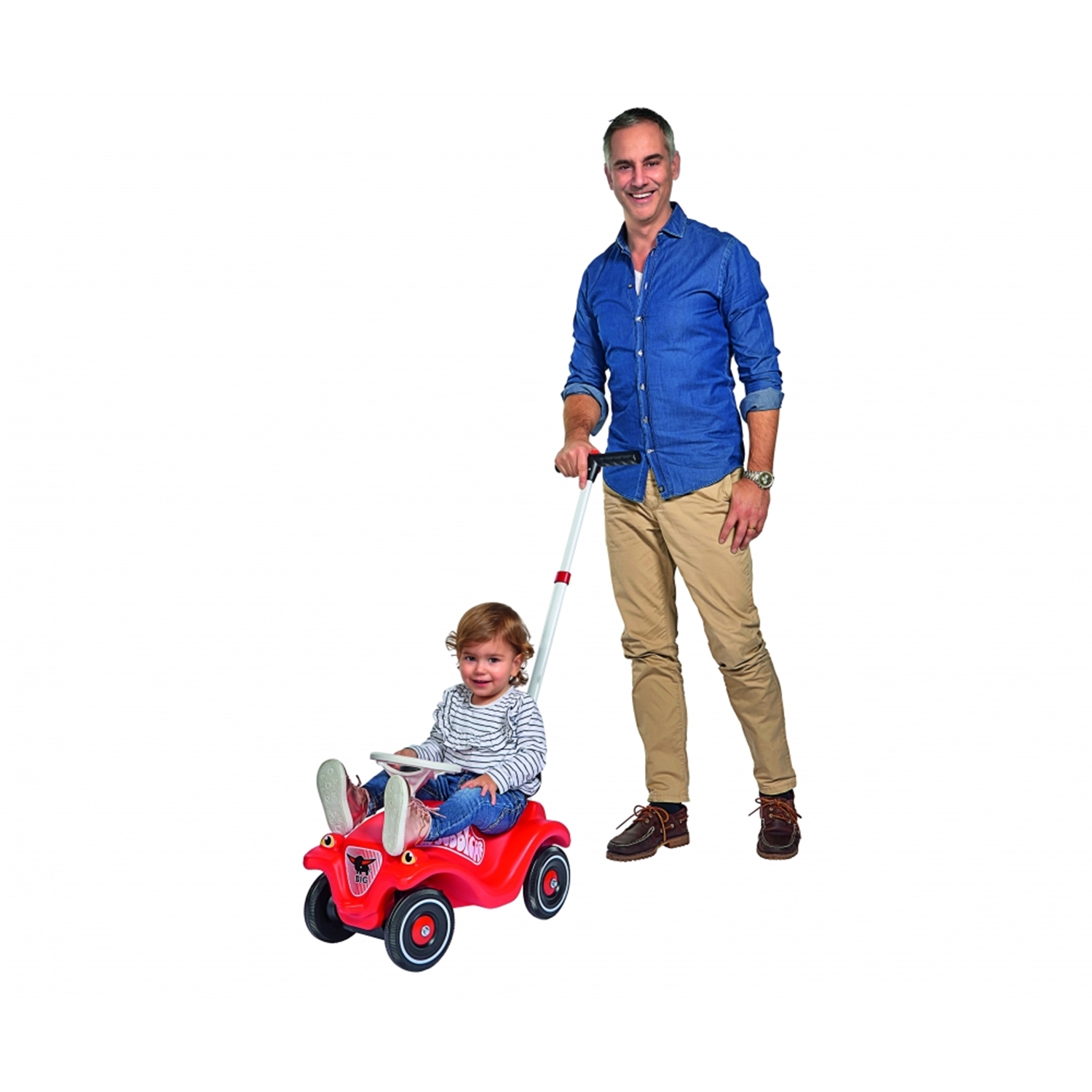 Mit Hilfe der Schubstange können Sie die BIG-Bobby-Car Modelle New, Next, Classic und Neo anschieben und lenken. Durch kurzes Drücken an der Lenkerstange kann die Fahrtrichtung gewählt und korrigiert werden. Mit der Lenker-Arretierung kann das Lenkrad festgestellt werden.