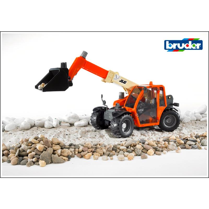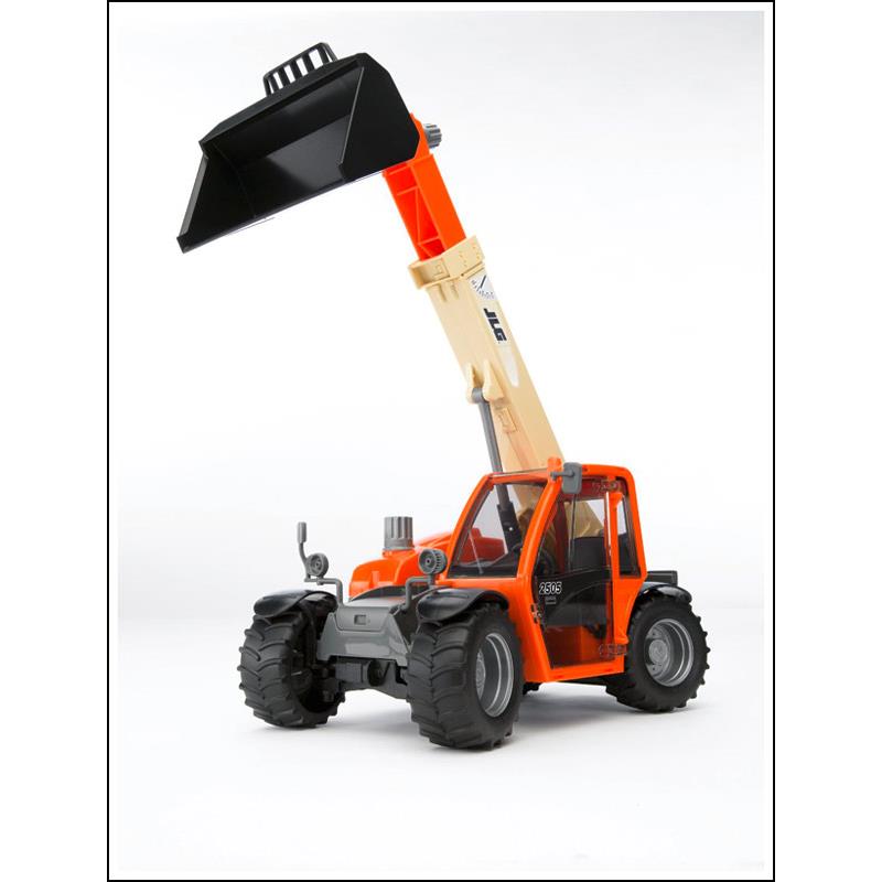 Der JLG Teleskoplader ist ein wahres Multitalent. Ob es um das Schaufeln von großen Erdmassen, oder um das Verladen von empfindlichen Gütern auf Paletten geht, jederzeit ist der JLG Teleskoplader ein zuverlässiger und effektiver Partner. Gerade seine geringen Abmessungen in Kombination mit dem weit ausfahrbaren Teleskoparm machen ihn oft zur ersten Wahl in den unterschiedlichsten Einsatzgebieten. Über vier silbern hervorgehobene Drehgriffe funktioniert die präzise Steuerung des JLG-Modells. Neben den Funktionen wie verstellen der Armhöhe, ausfahren des Arms und derWinkelverstellung der Werkzeugaufnahme verfügt der Teleskoplader über eine gut arbeitende Vierradlenkung. Diese Lenkung des JLG Teleskopladers macht das Handling des Fahrzeuges, sowohl beim Original, als auch bei dem Modell von BRUDER, zu einem Kinderspiel.