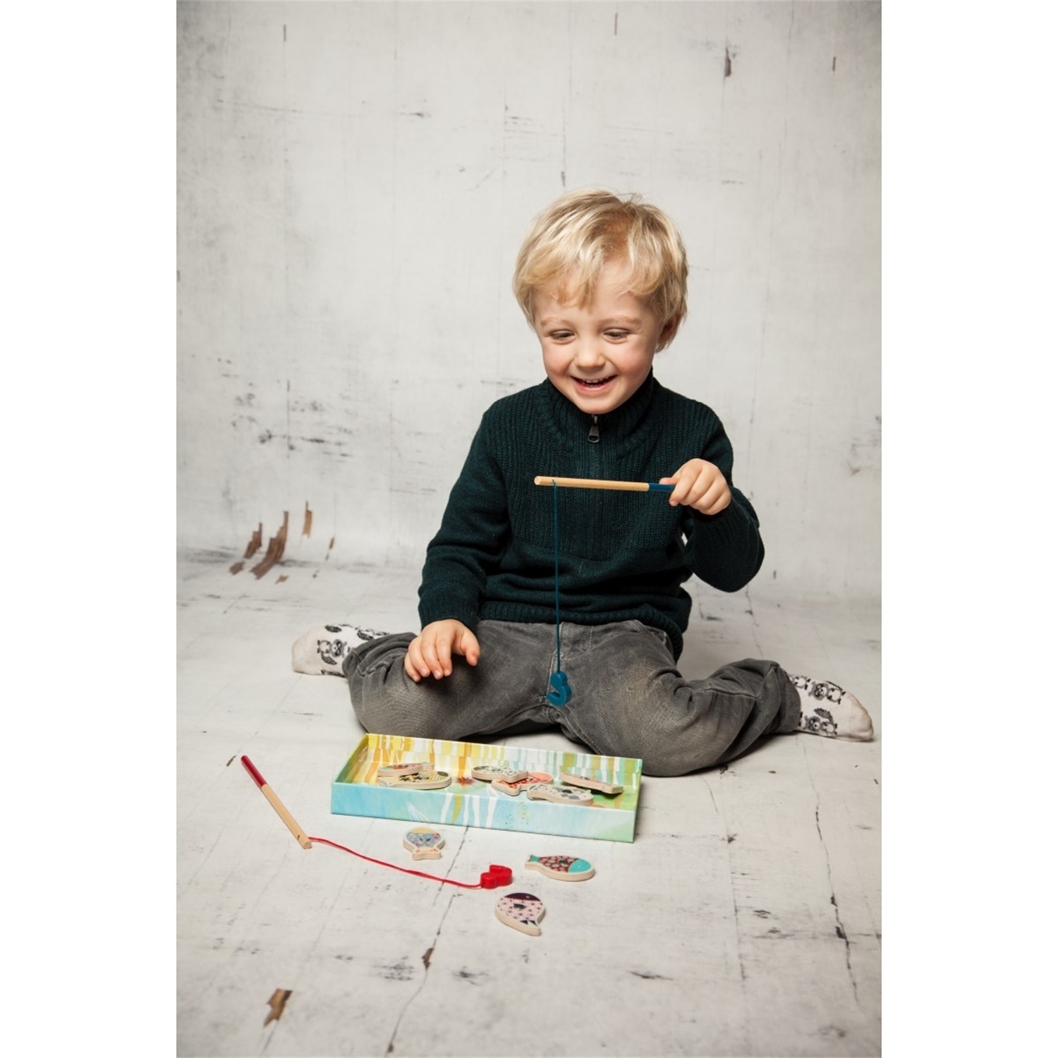 Bei diesem wundervollen Spiel lernen die kleinen das Fischen mit Hilfe einer Angel. Die Angelruten sind mit einem Magneten versehen, womit das Fangen der Fische möglich wird. Im inneren der Box befindet sich der Meeresboden worin sich die niedlichen Fische befinden.
