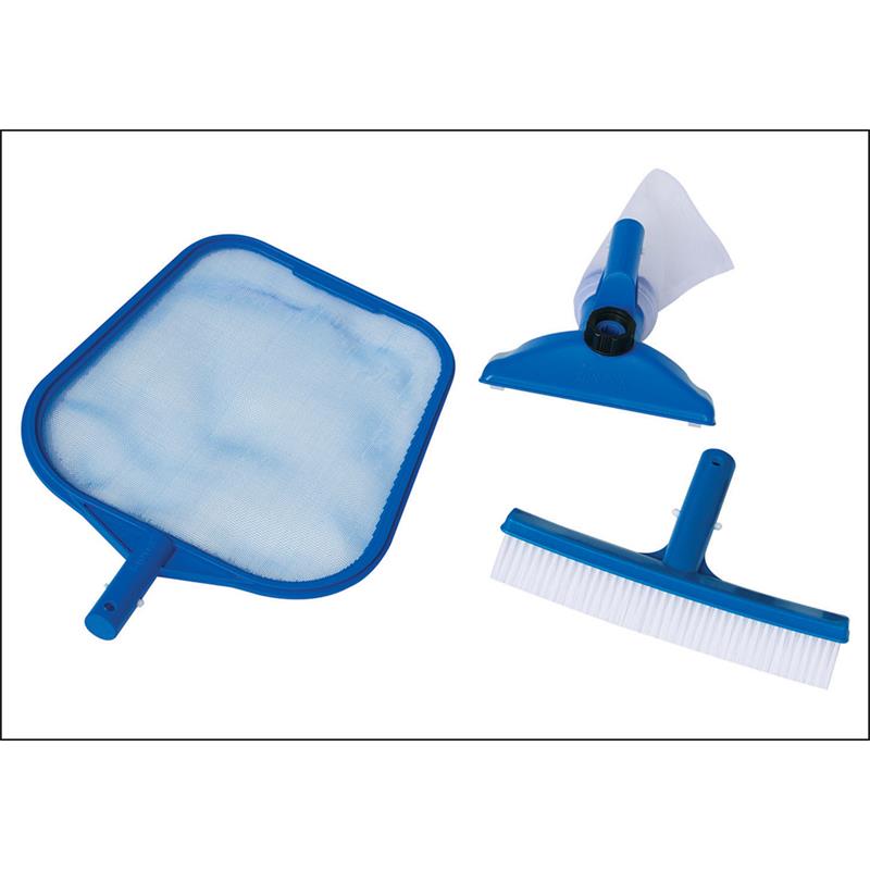 Mit diesem Reinigungsset kann man dafür sorgen, dass der heimische Pool schön und sauber bleibt. Das Set besteht aus einem Bodensauger mit Laubnetz (zum einfachen Anschluss an den Gartenschlauch), einem Laub- bzw. Bodenkescher und einer Becken-Reinigungsbürste. Der Bodensauger und die Reinigungsbürste sind passend für Teleskopstangen mit einem Durchmesser von 26,2 mm (Intex Art. 29054 und 50004, nicht im Lieferumfang enthalten).