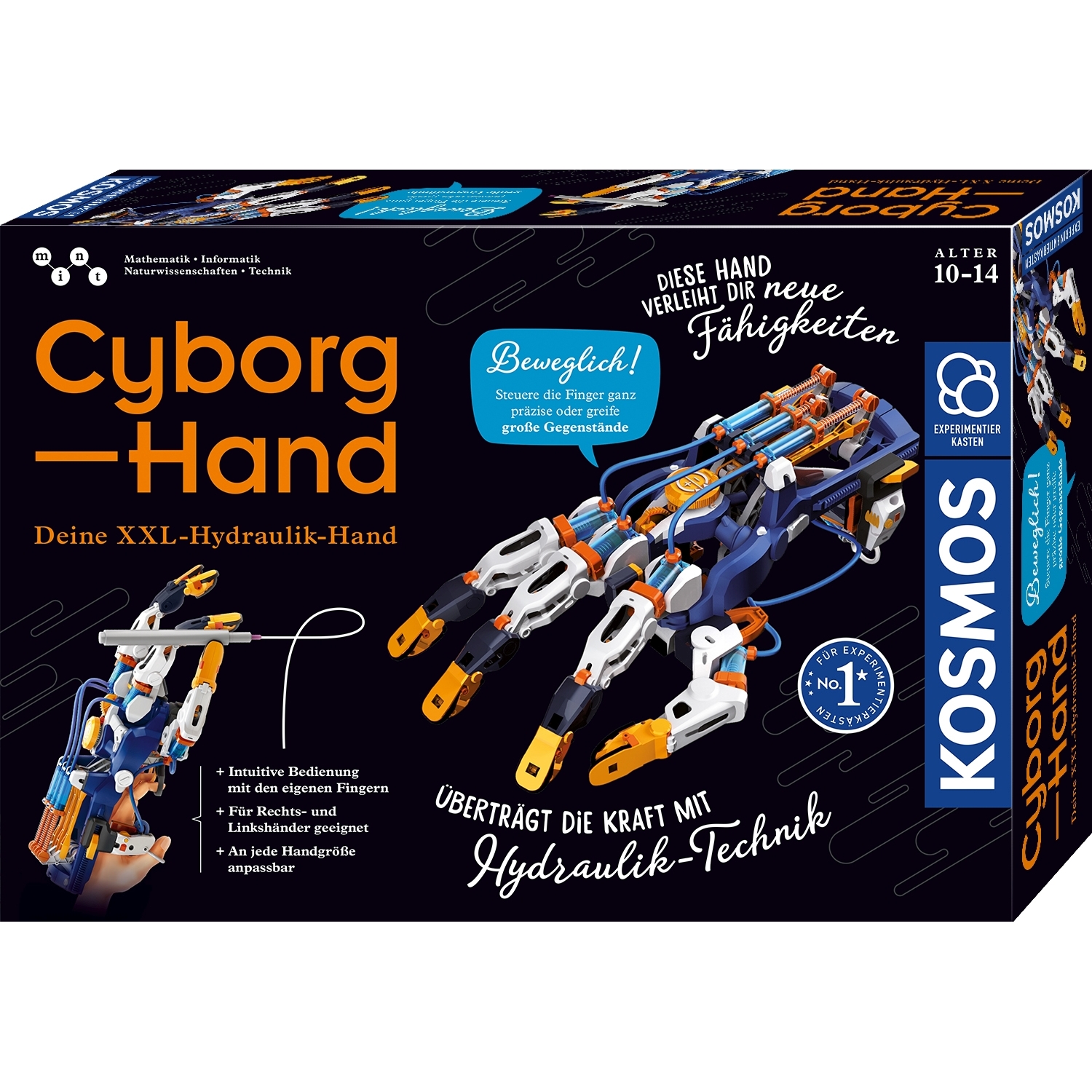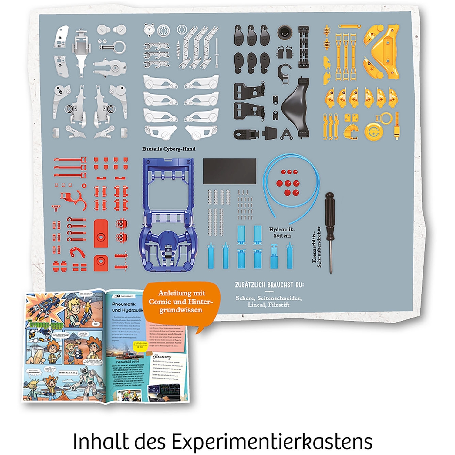 Bauen, tüfteln, ausprobieren – in der Cyborg-Hand steckt echter Technik-Spaß! Kinder bauen das mechanische Exo-Skelett aus vielen Einzelteilen zusammen, den passenden Schraubendreher finden sie in dem Set. Ist die Exo-Hand fertig, wird sie über die eigene gezogen und schon werden die Bewegungen präzise auf die künstliche Hand übertragen. Genial: die Roboterhand funktioniert hydraulisch, also nur über den Druck von Wasser!