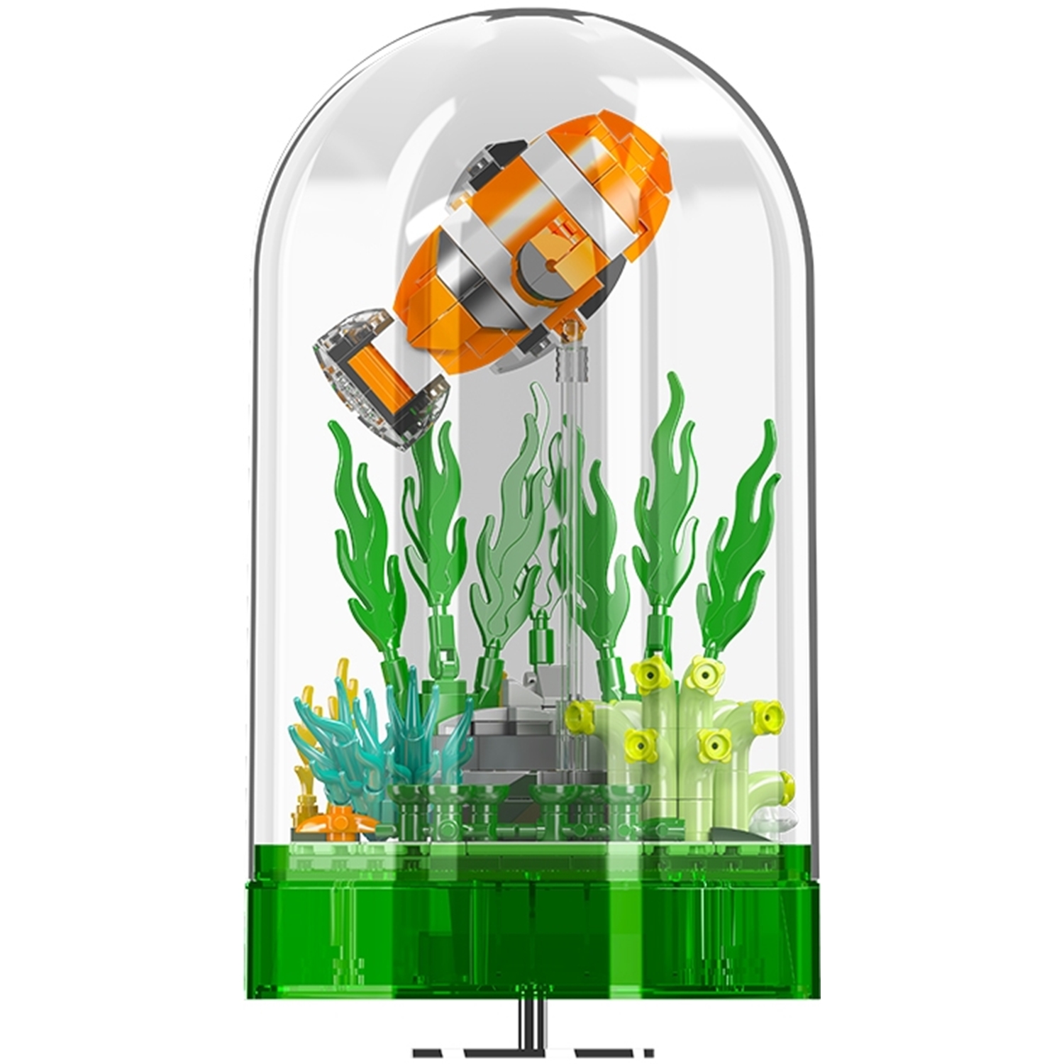 Der orange-weiße Clownfisch schwimmt zwischen detailreichen Korallen und Wasserpflanzen, während stimmungsvolle LED-Leuchten die Szene in ein sanftes Licht tauchen. Die integrierte Spieluhr spielt eine beruhigende Melodie und macht das Set zu einem entspannenden, atmosphärischen Blickfang. Dank der beiliegenden Staubschutzhülle bleibt das Modell dauerhaft geschützt – perfekt für alle, die Meerestiere lieben und ein einzigartiges Deko-Highlight suchen.